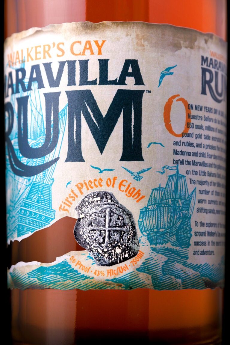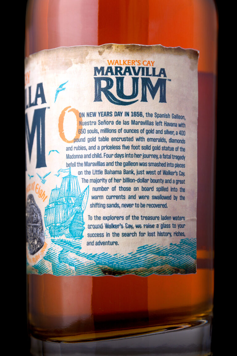 The branding and label for the Maravilla Rum represents the fateful trip of the Spanish Galleon, Nuestra Senora de las Maravillas on New Year’s Day in 1656. Four days into her journey she smashed to pieces on Little Bahama Bank with 650 souls on board. In addition to the tragic loss of life, millions of ounces of gold and silver were spread across the ocean floor along with a 400lb gold table encrusted with emeralds, diamonds and ruby’s, and a priceless 5ft statue of Madonna and child. To this day, most of this treasure remains undiscovered.