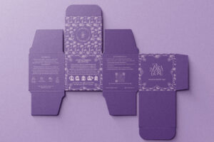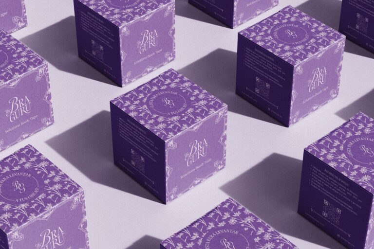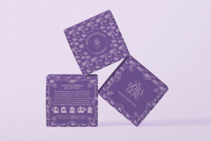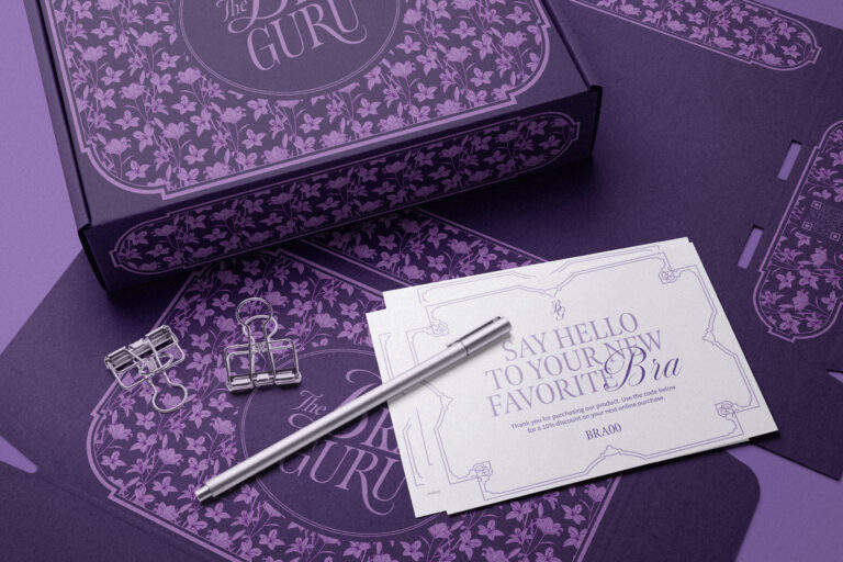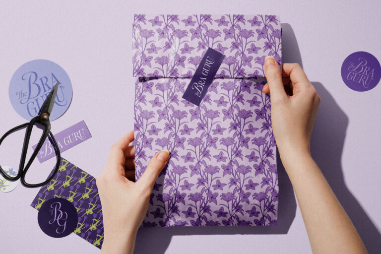 Boobgie”. Since they refer to their clients as goddesses and queens, getting inspiration from the Rococo and Art Nouveau movements was a no-brainer. Colors were easy since were already using purples and pinks so we stuck with a purple palette but made it regal. We went Rococo with frame elements and Art Nouveau with the florals. We went all in with this brand. From the branding to the packaging to the photographic style. Just in time for their 8th anniversary.